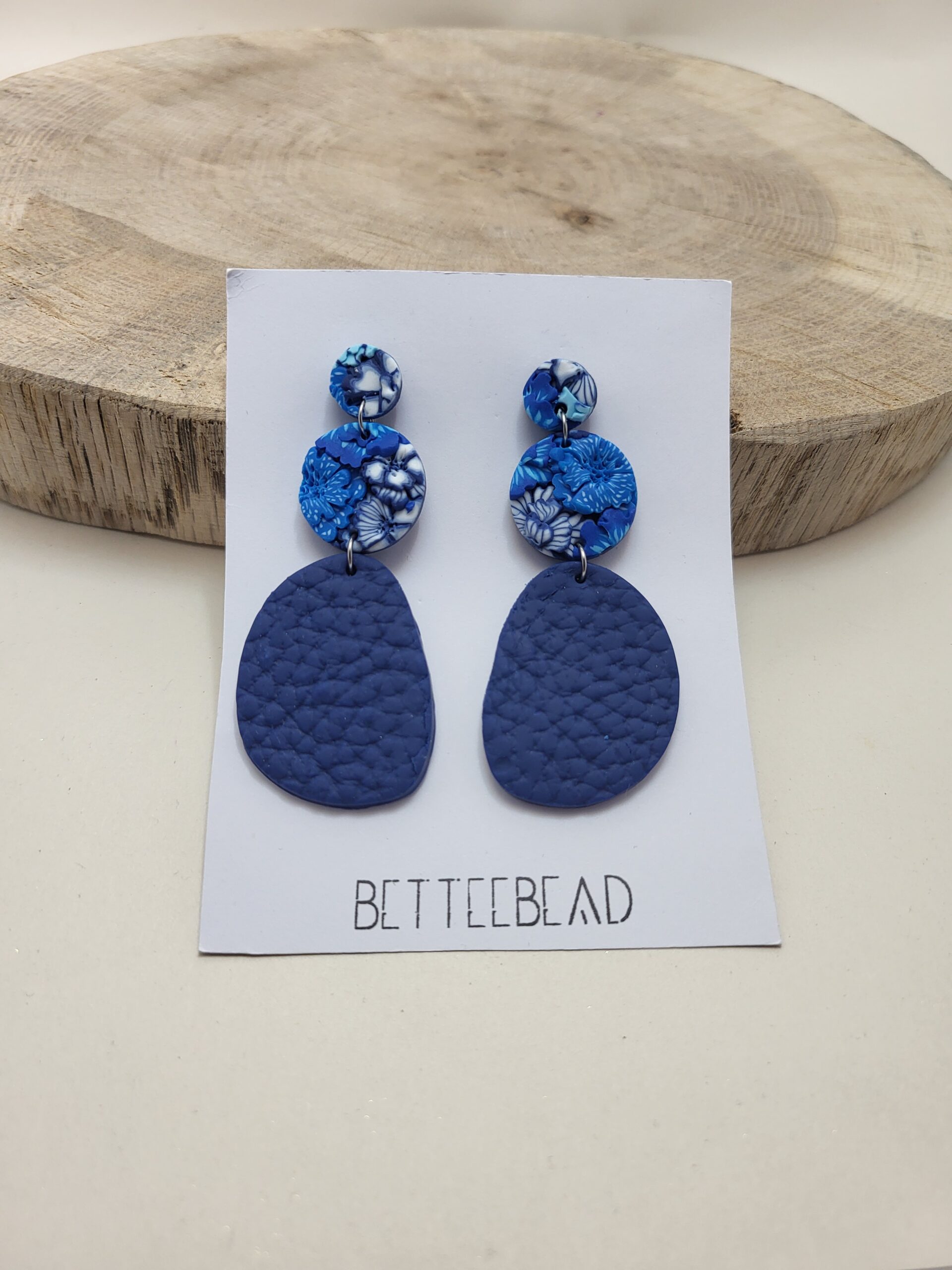 Kék árnyalatok és fehér kombinációjából született virágos fülbevaló.