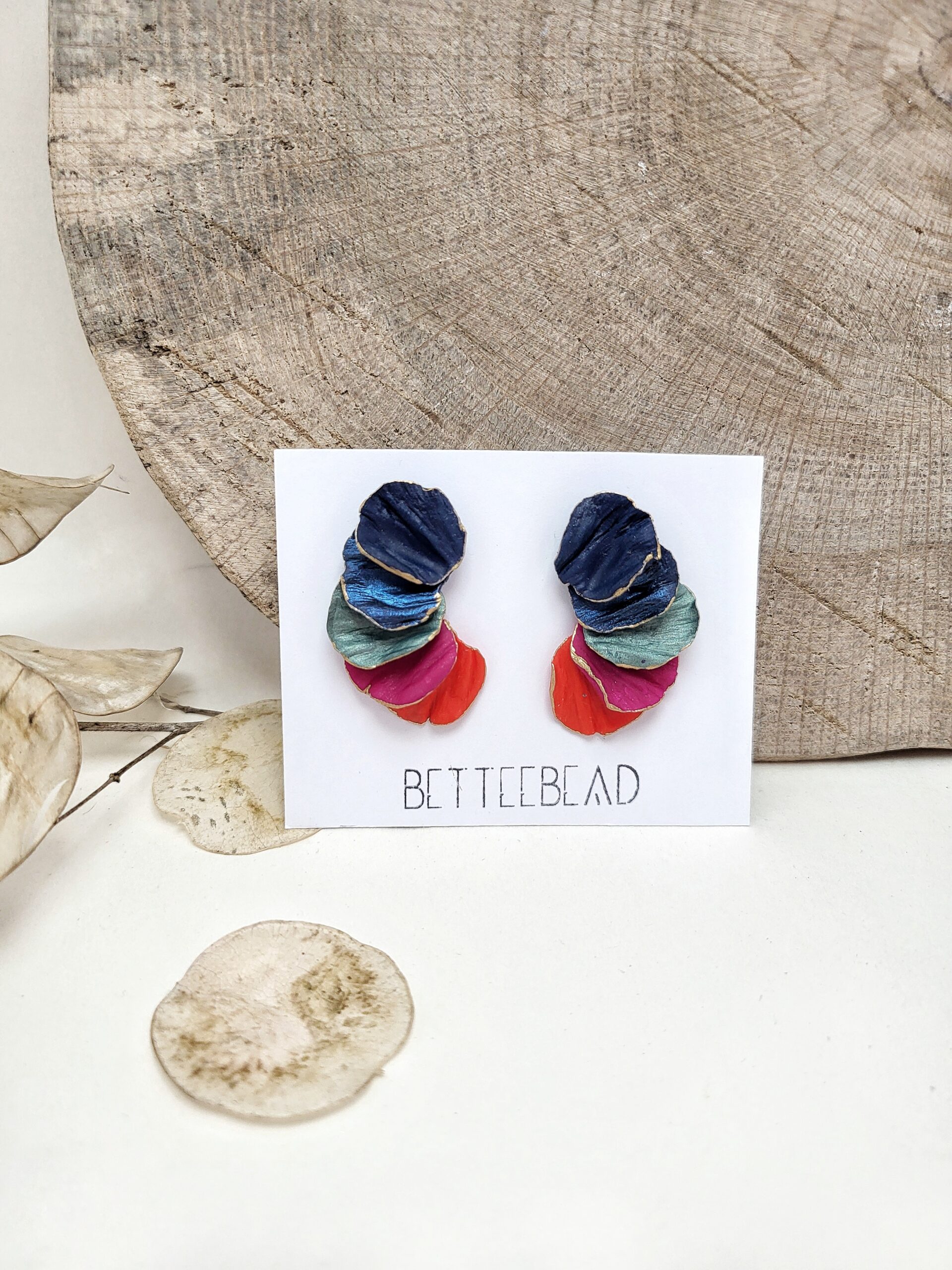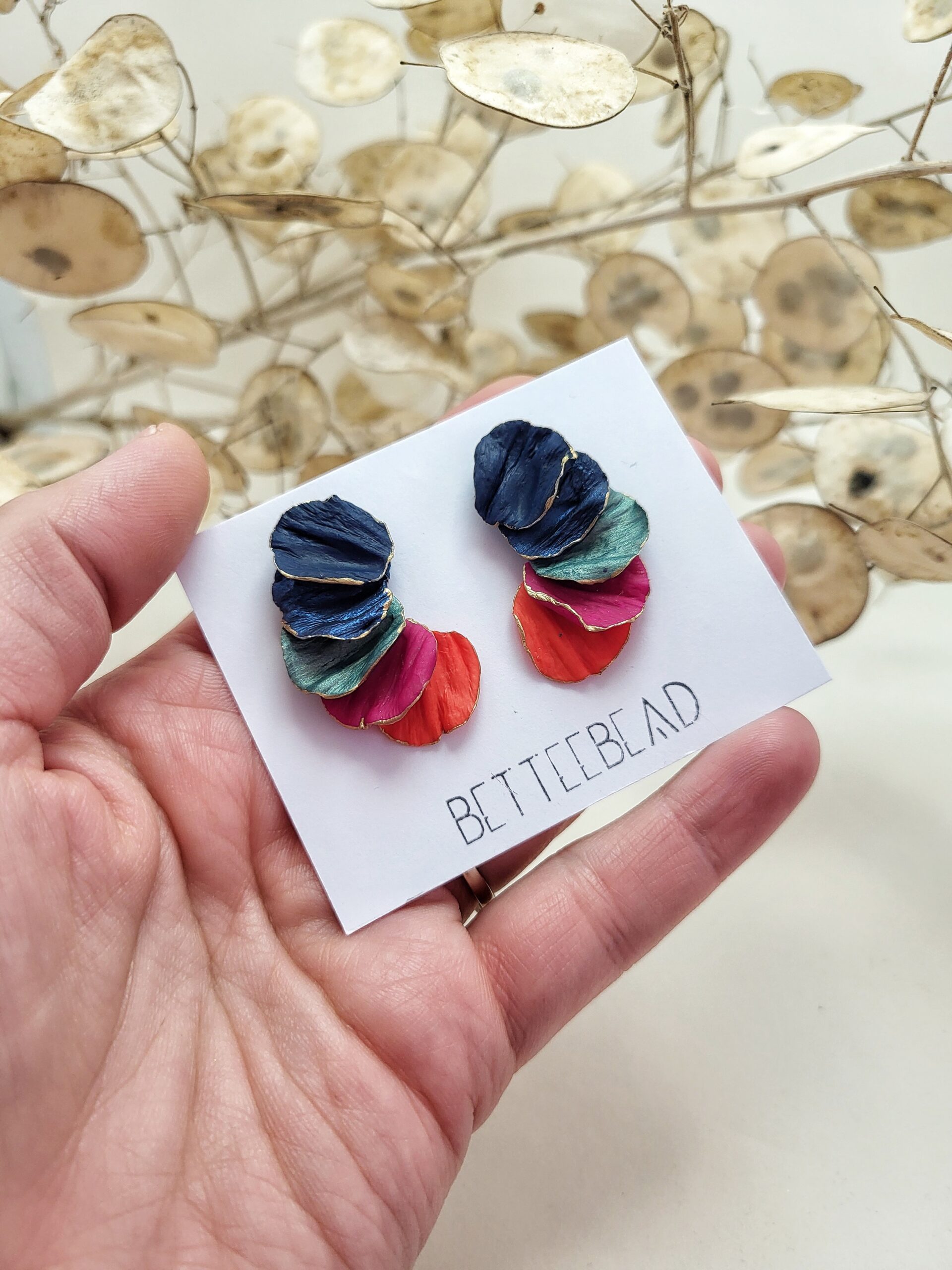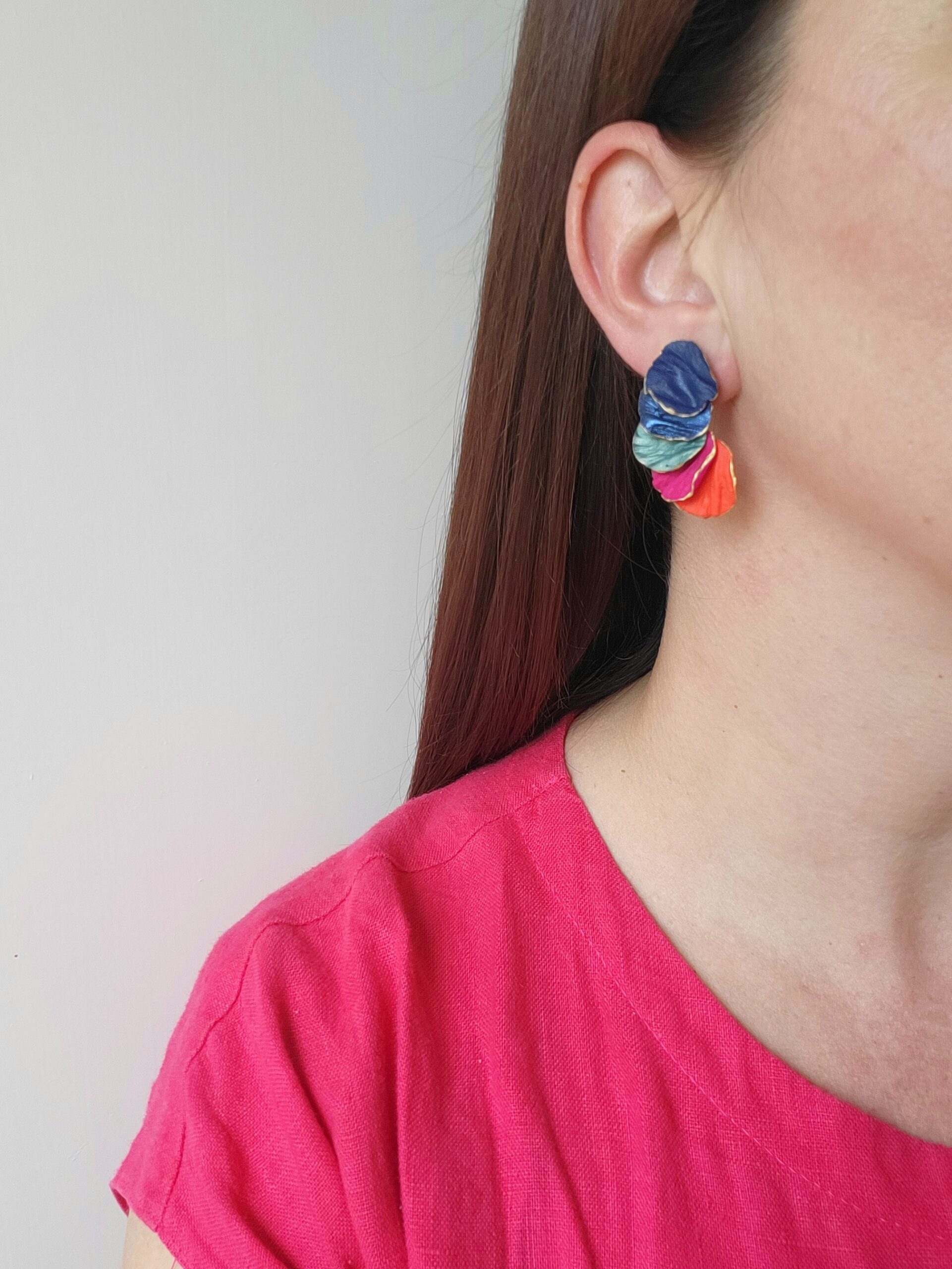 Sötétkék, fuxia, türkizarany és sötét narancs színek kombinációjából készült fülbevaló, amelyet metálfény és a virágszirmok erezetének mintája díszít.